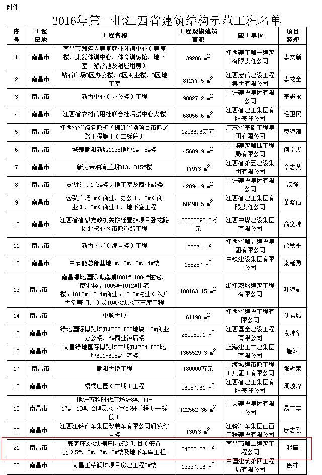 由南昌市第二建筑工程公司承建的郭家莊B地塊棚戶區(qū)改造項(xiàng)目(安置房)5#、6#、7#、8#樓及地下車庫(kù)工程獲“2016年第一批江西省建筑結(jié)構(gòu)示范工程” [摘自贛建質(zhì)監(jiān)字[2016]1號(hào)]。