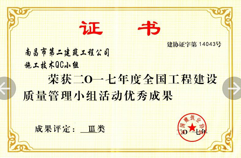 在中國建筑業(yè)協(xié)會組織的2017年度QC成果發(fā)布會上,公司QC小組的《提高GC發(fā)泡水泥保溫板外墻外保溫施工質(zhì)量》成果榮獲2017年度全國工程建設(shè)質(zhì)量管理小組活動優(yōu)秀成果獎;付瑞平同志榮獲2017年度全國工程建設(shè)QC小組活動優(yōu)秀推進者稱號。