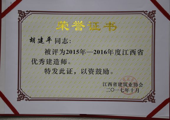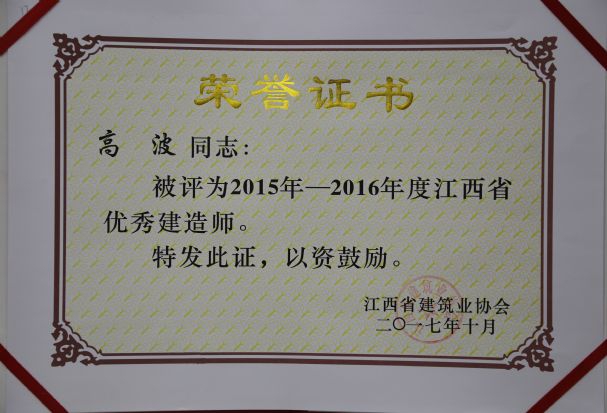 江西省建筑業(yè)協(xié)會對公司頒發(fā)了2015-2016年度江西省建筑業(yè)先進(jìn)企業(yè)榮譽(yù)稱號,對公司建造師何靜、胡建平、高波、章壽榮頒發(fā)了2015-2016年度江西省優(yōu)秀建造師榮譽(yù)稱號。