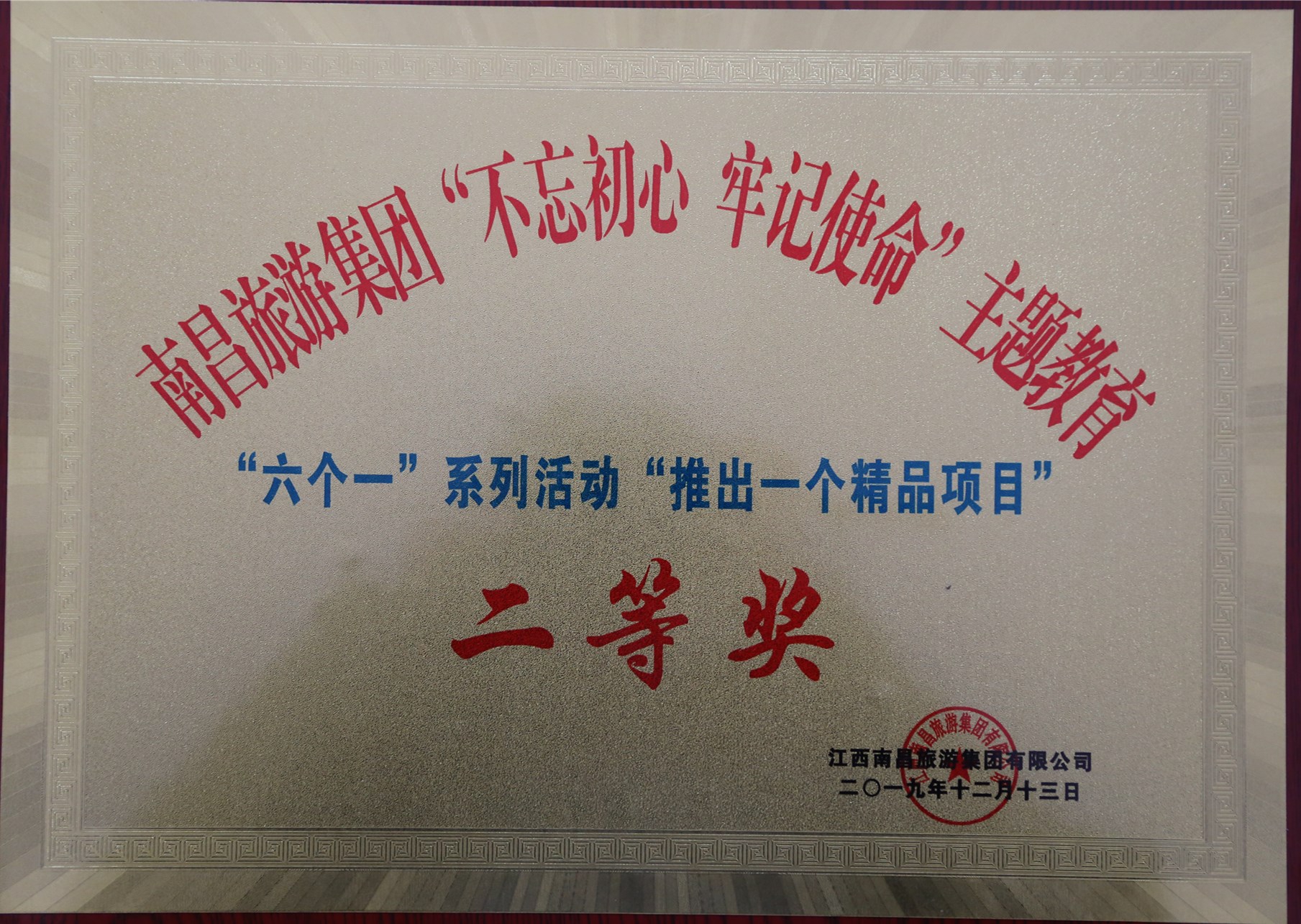 12月13日下午,南昌旅游集團在滕王閣會見廳召開“不忘初心、牢記使命”主題教育“六個一”活動暨董事長獎勵表彰大會,我公司參評的“推出一個精品項目”榮獲二等獎,“突破一個基層難點”榮獲三等獎,“樹一個模范人物”、“講一個初心故事”、“擦亮一個服務窗口”、“創(chuàng)一個先鋒黨支部”榮獲優(yōu)秀獎。另外,我公司參與合作的“繩金塔項目EPC招標攻堅團隊”榮獲董事長特別獎。